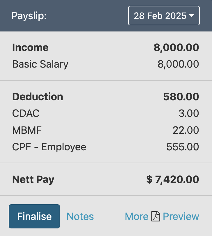 SimplePay automatically calculates statutory deductions for CPF and Self-Help Group Funds, and you will see these in the Payslip block, along with all of the other items you added above. When viewing the information in the Payslip block, you have the following options: